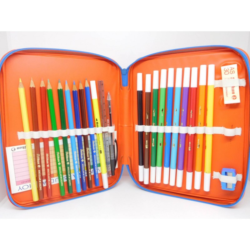 Una joya completa de diseño ochentero. Pelikan fue líder en material de colegio en los años 80, con sus estuches rígidos y con este tipo de estuches. Consigue algo que seguro que recuerdas. Completo y en perfecto estado porque te ha estado esperando todos estos años. Enseña a tus hijos como eran las cosas cuando sus padres tenían su edad.