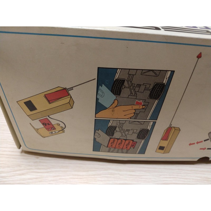 Tanto caja como contenido bien conservado. Perfecto estado, tanto caja como contenido. Tiene su mando y los interiores de la caja. Sin defectos reseñables. Lleva 2 pilas de 9V (una el coche y otra el mando) y 3 pilas de 1,5V. No probado, pero viendo su estado y las conexiones (ver fotos) muy posiblemente funcione. Las fotos forman parte de la descripción.